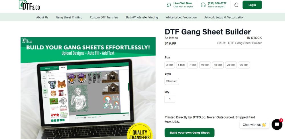 Once you visit the builder, you will land on a screen as shown in the image. Choose your preferred size, style, and order quantity. You can choose a size from 2 feet to 30 feet. Once selected, click the “Build your own Gang sheet” button.