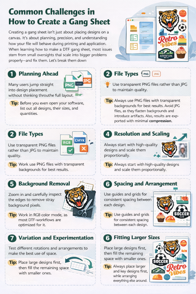 Creating a gang sheet isn’t just about placing designs on a canvas. It’s about planning, precision, and understanding how your file will behave during printing and application. When learning how to make a DTF gang sheet, most issues come from small oversights that scale into bigger problems. Let’s break them down properly—and fix them.